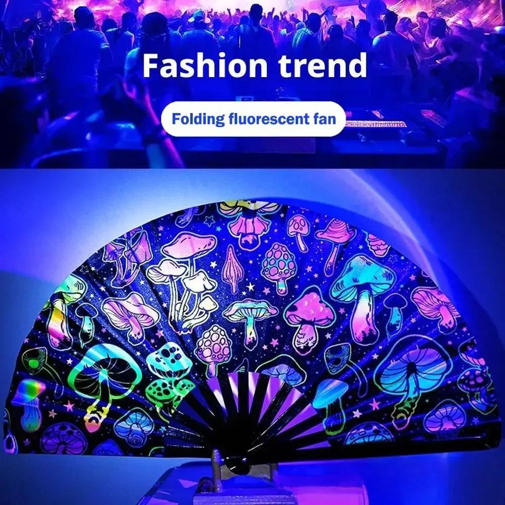 GEMAKKELIJK TE GEBRUIKEN: opvouwbare draagbare 13 inch grote ventilator, we gebruiken fluorescerende inkt om de ventilator prachtig te laten gloeien onder UV-licht (zwart feestlicht) en de kleur nooit vervaagt.Een snelle klik van de pols zet de ventilator aan, waardoor het ultieme knallende geluid ontstaat en kan ook worden gebruikt als koelaccessoire of parasol bij warm en vochtig weer.