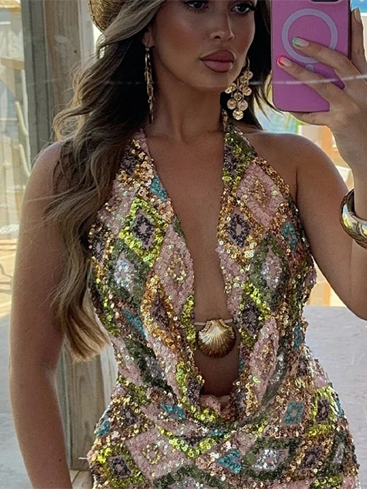 Deze tweedelige set is voorzien van een sexy haltervest en shorts met pailletten en straalt elegantie uit in strandstijl.